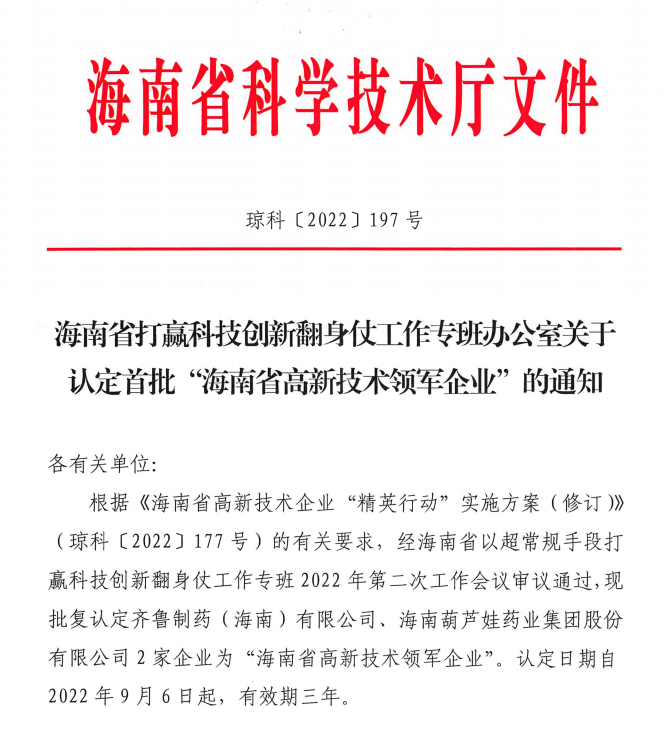 近日,海南省科学技术厅发布的《海南省打赢科技创新翻身仗工作专班办公室关于认定首批“海南省高新技术领军企业”的通知》中显示,批复认定海南富易堂药业集团股份有限公司等2家企业为“海南省高新技术领军企业”。认定日期自2022年9月6日起,有效期三年。